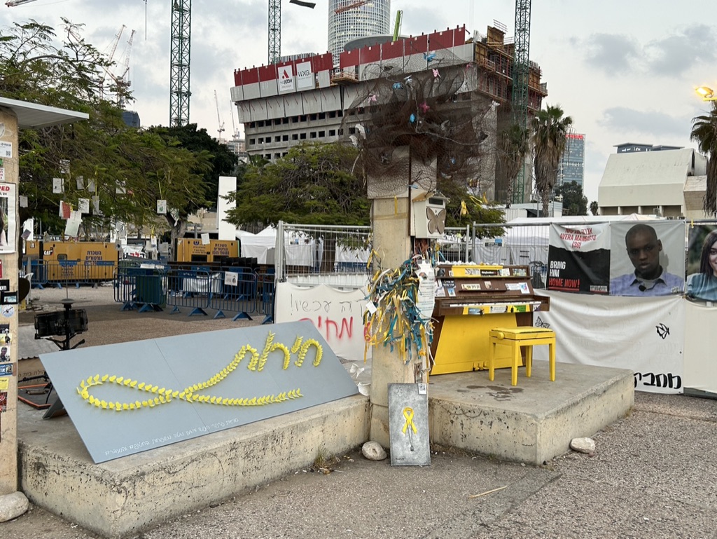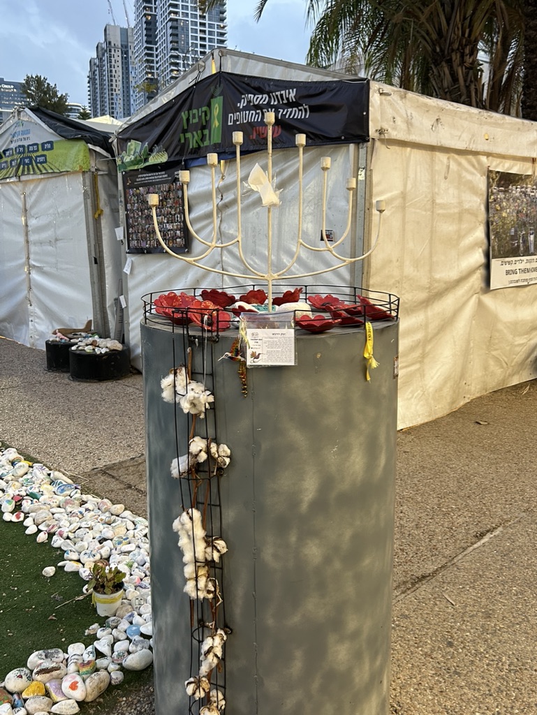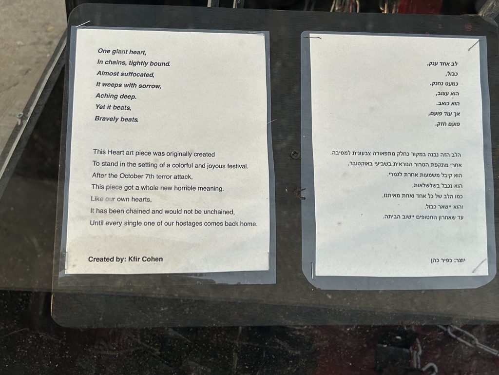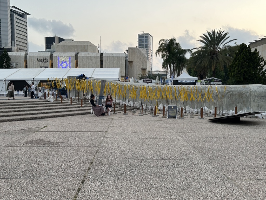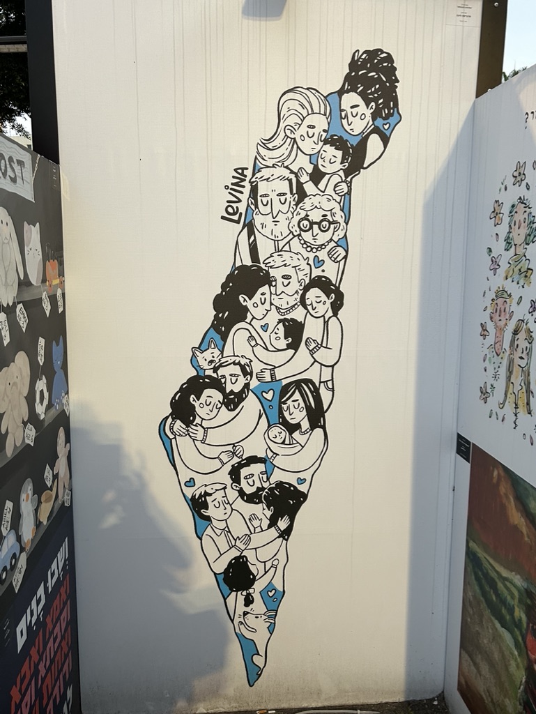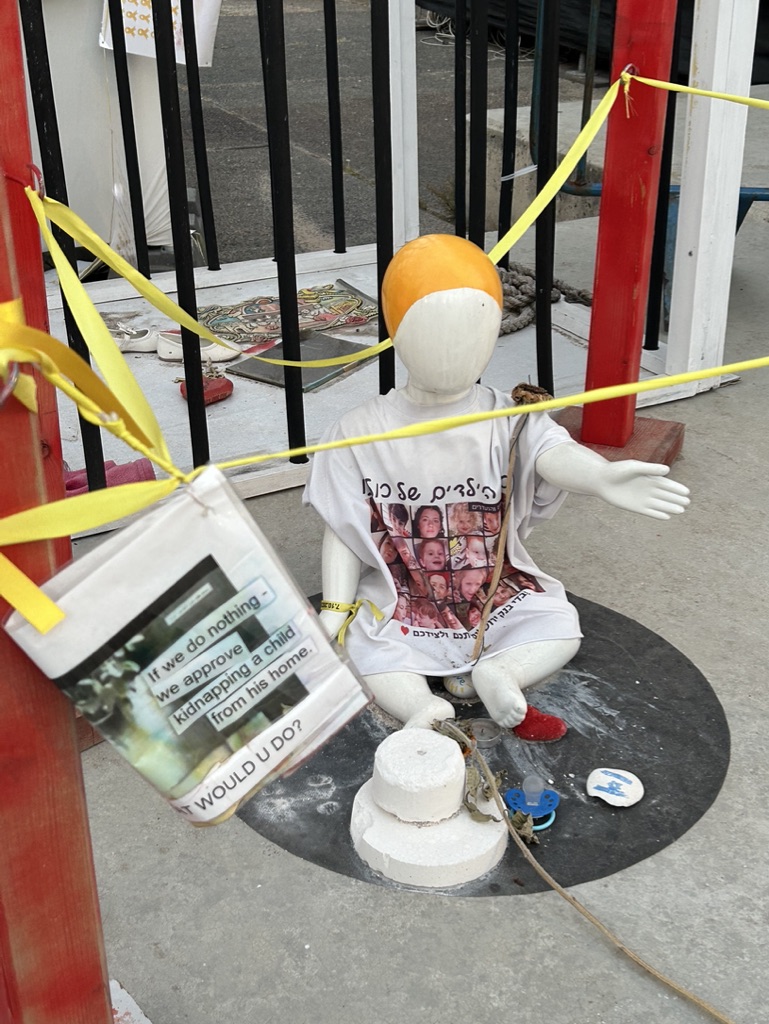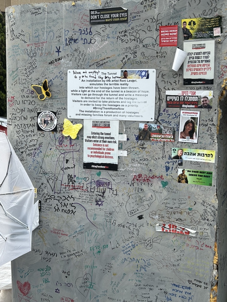The square is located across the street from government military buildings similar to the Pentagon. When we arrived, it was eerily quiet. I am going to share the myriad of photos we took as we walked silently around the square, noting all of the art installations dedicated to peace and rescuing the hostages. There is also video capturing the experience of October 7th. It is a political space, a solidarity space, a space for remembrance, and a space for hope.