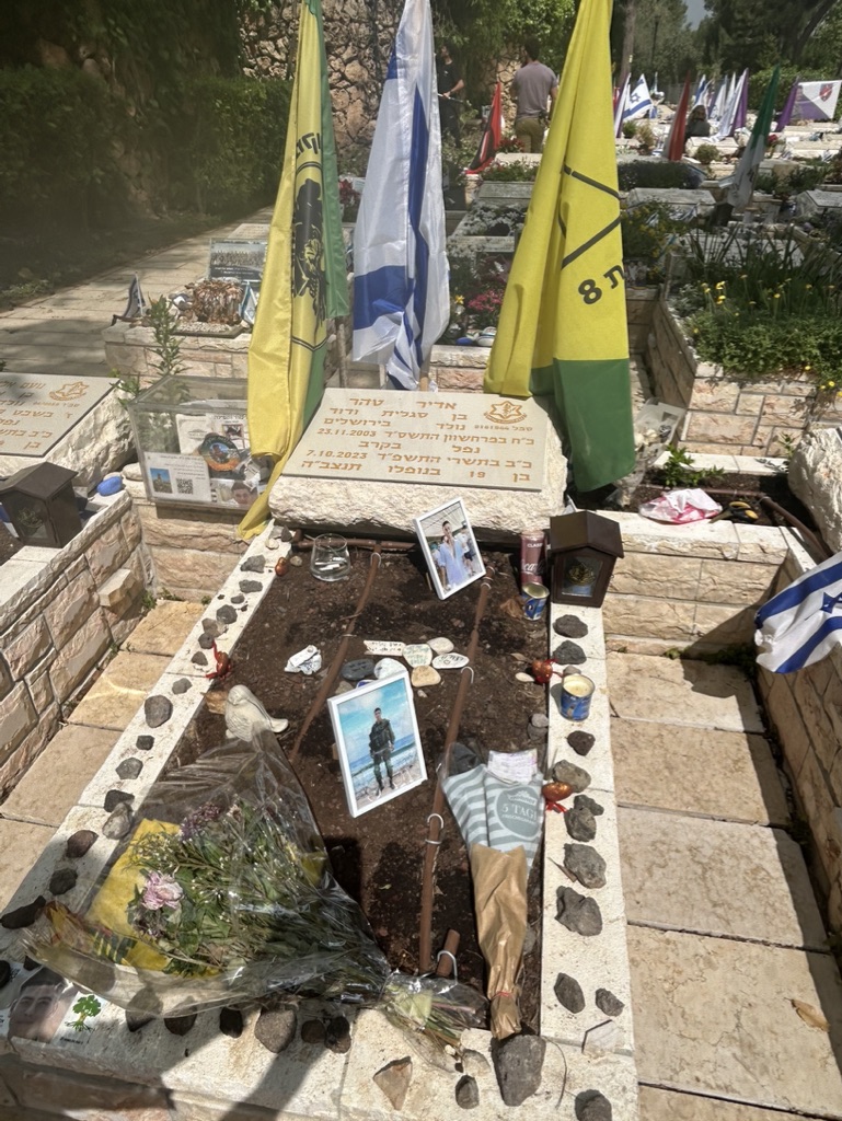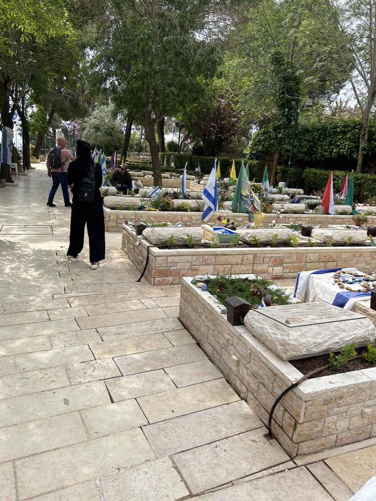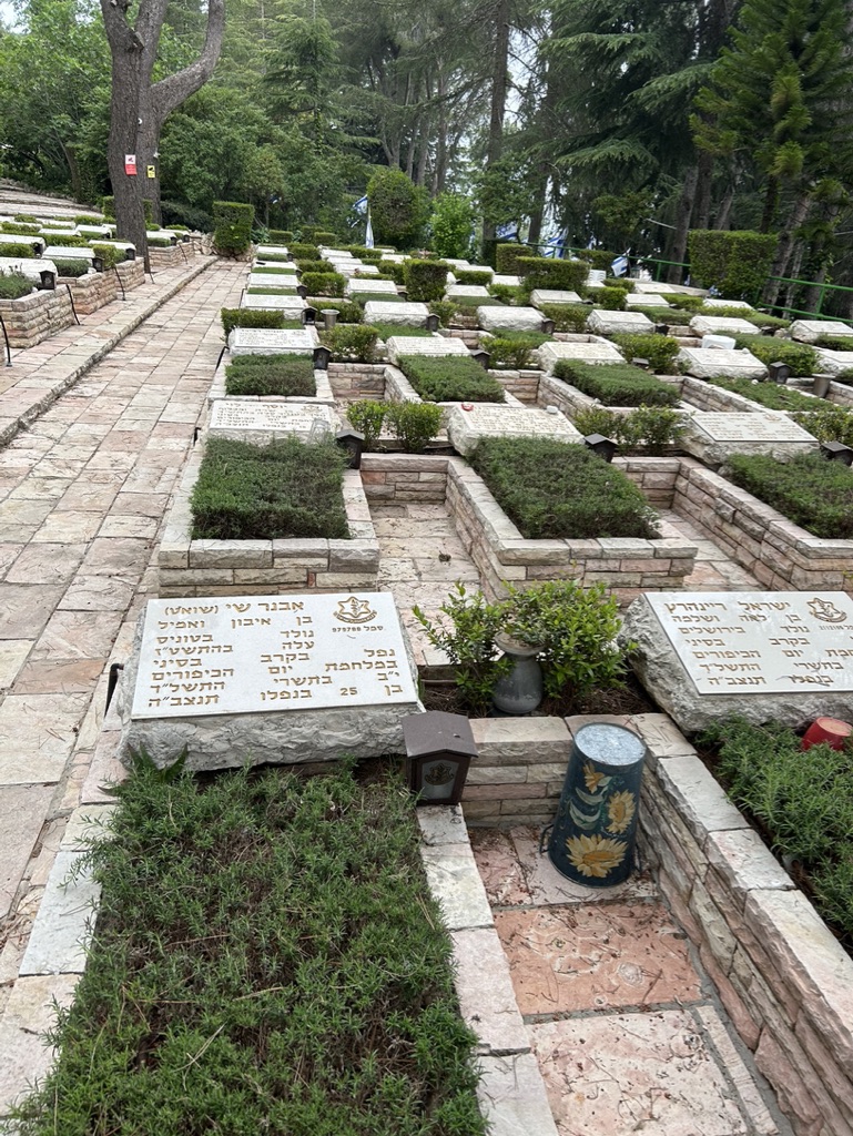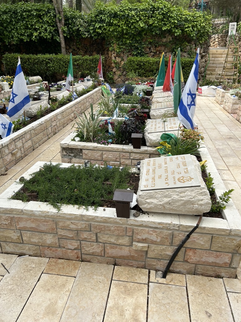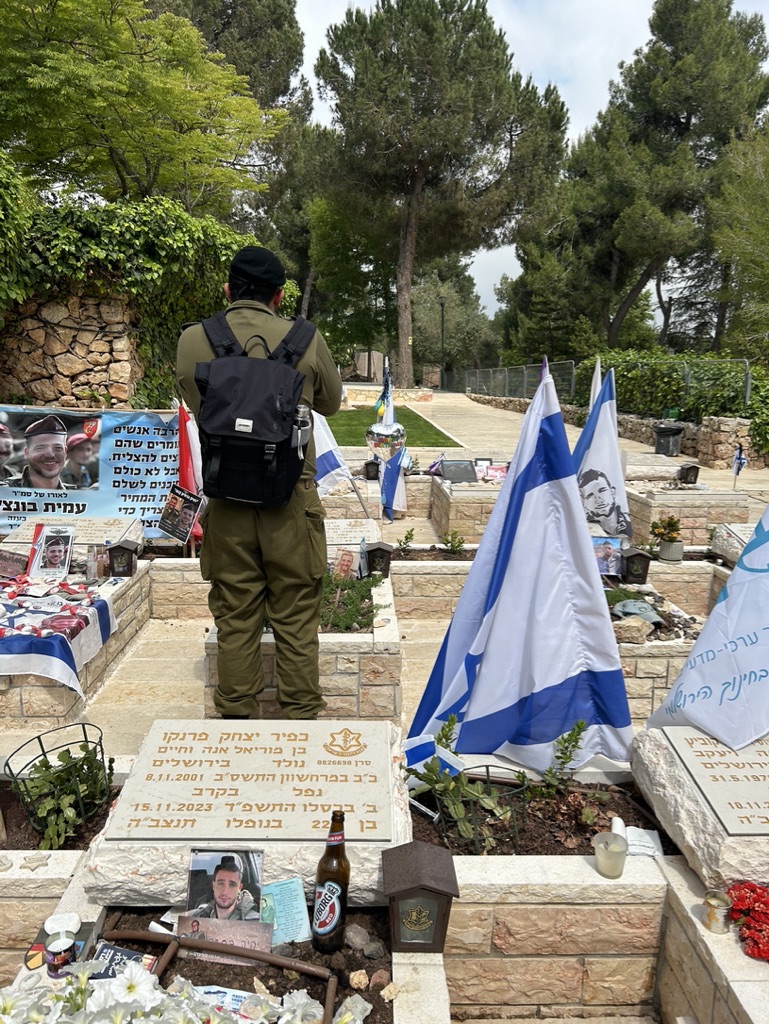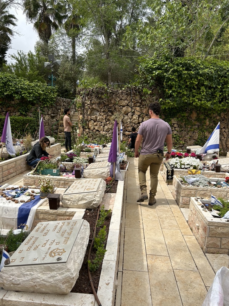 Today we walked through rows and rows of memorials to people struck down on October 7th. We observed a man in front of the grave of his friend, in full army uniform, crying at the feet of his dead friend.