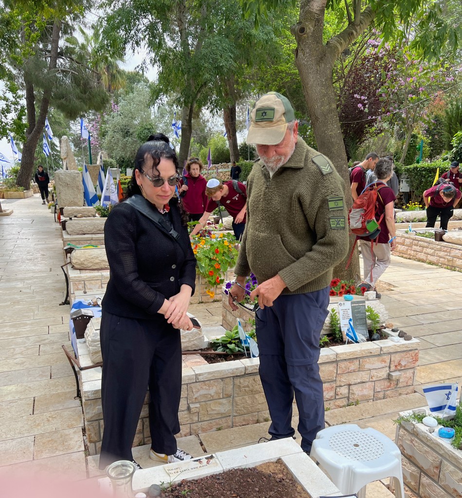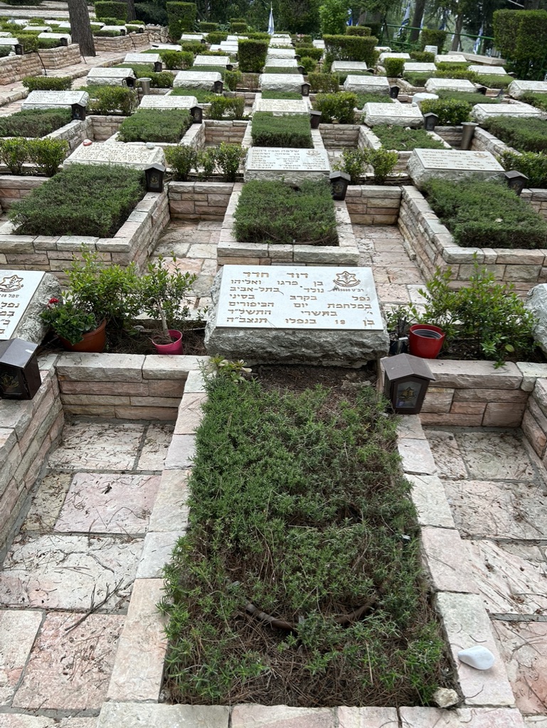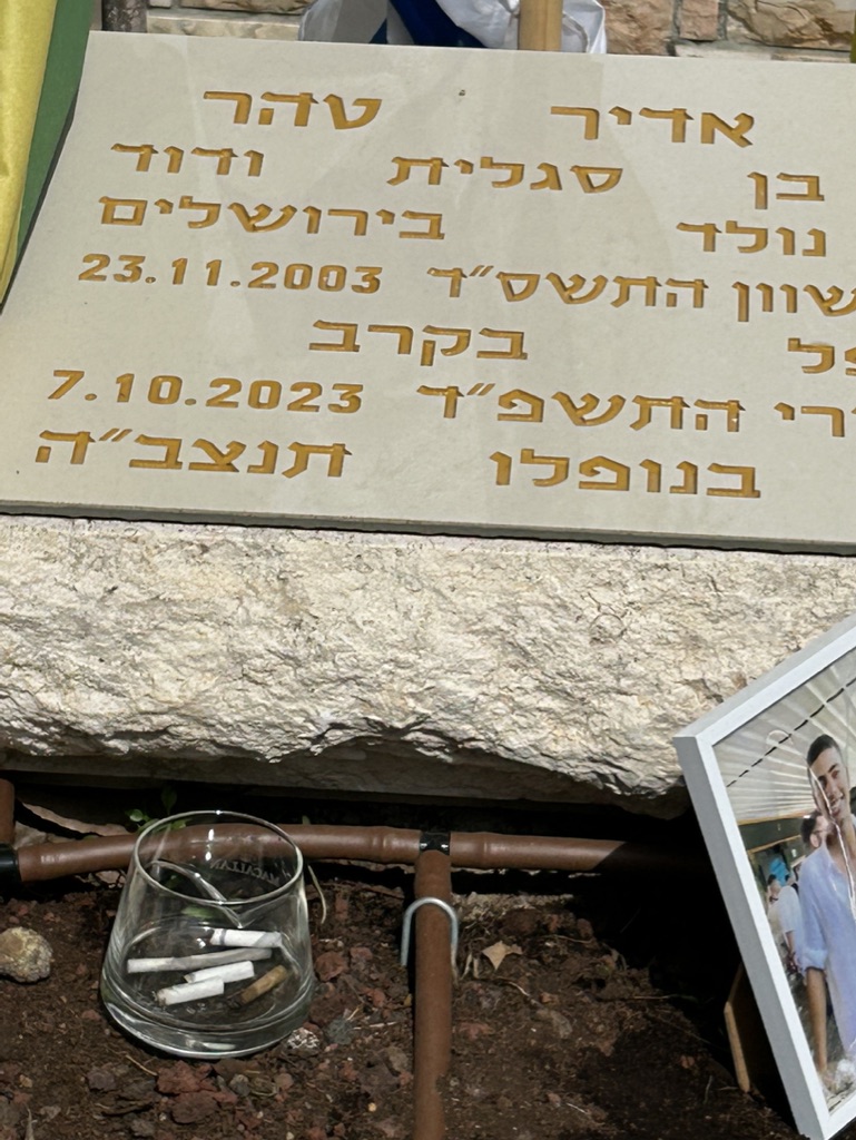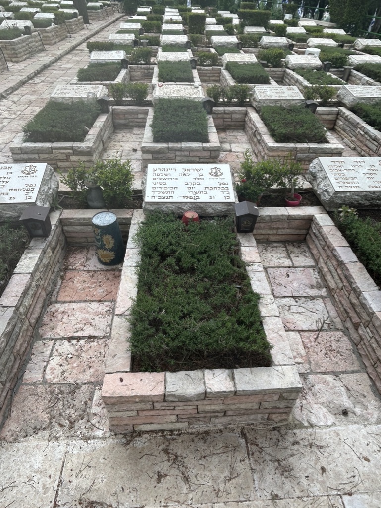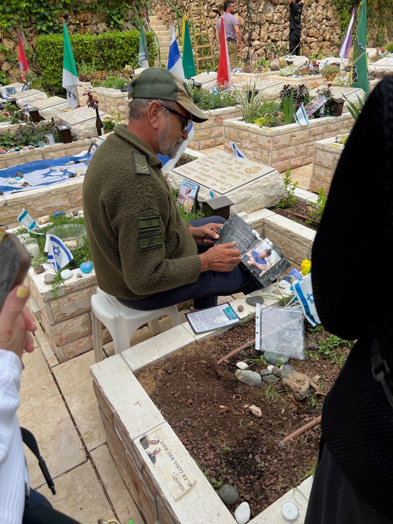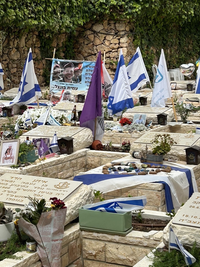 Today we walked through rows and rows of memorials to people struck down on October 7th. We observed a man in front of the grave of his friend, in full army uniform, crying at the feet of his dead friend.